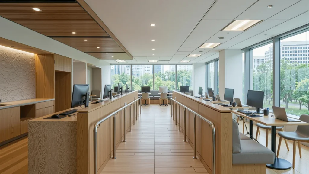 Multifunctional layouts allow the same area to serve staff work, public service counters, and short meetings without overcrowding the office.
